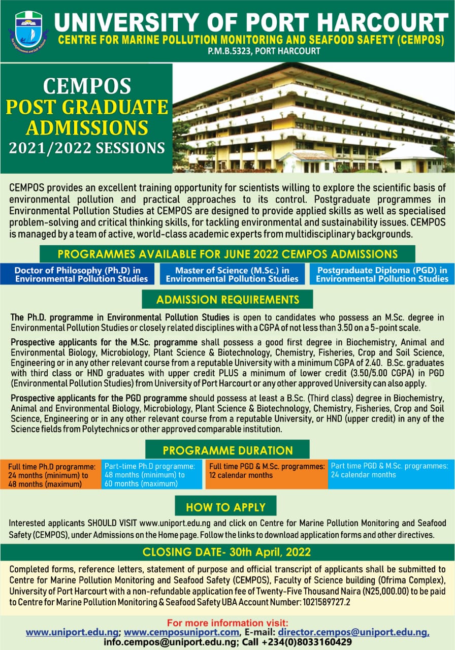 The Centre for Marine Pollution and Seafood Safety offer post-graduate programmes (PGD, MSc and PhD) in Environmental Pollution Studies. For specific information about any of our programmes, please follow the links below.